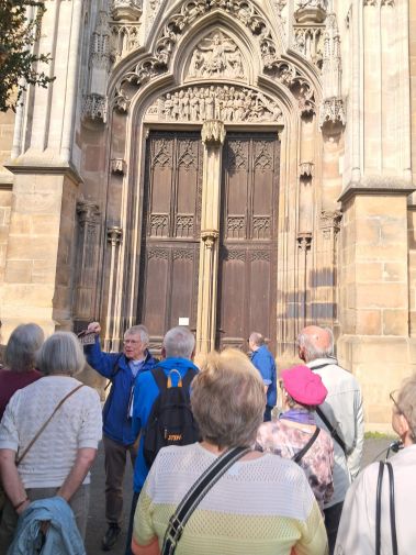 Der mächtige und dennoch filigrane gotische Turm mit 72 Meter Höhe wurde 1516 mit der Turmspitze vollendet und beeindruckte uns sehr. Sehenswert sind auch die Bogenreliefs über den beiden Portalen mit den Themen Christus als Weltenrichter und der Geburt Christi und dem Tod Marias. Herr Bessey zeigte uns auch die zahlreichen Wasserspeier, aus Stein gemeißelte Dämonengestalten, von denen jede einen speziellen Namen hat.
