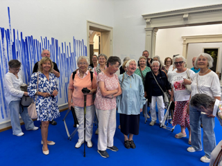 Die “Kurzen Wege” führten zunächst durch den weitläufigen Park bis hin zur Ausstellung „(K)eine Pause- Ausruhen im digitalen Zeitalter” in der Villa Merkel. Der Leiter der Villa Merkel, Sebastian Schmitt, und die Kunstvermittlerin, Johanna Knoop, begrüßten zunächst die Teilnehmer. Besonders beeindruckend: Die farbigen Wasserläufe am Eingang der Villa in Gelb, Magenta, Blau und Schwarz, die Grundfarben des modernen Printdrucks. Eine Statue aus Ton mit auffällig großem Daumen – Symbol für die intensive Nutzung mobiler Geräte – regte sogleich zum Nachdenken an. Darüber hinaus konnten die Besucher mit einem senkrechten, blauen Pinselstrich – bestimmt durch die Dauer ihres Ausatmens – interaktiv Teil der Ausstellung werden. So entstand ein kollektives Kunstwerk aus Atemzügen. Sebastian Schmitt lenkte den Blick nun auf Details: Kunstvoll gefaltete Kissen luden zum Innehalten ein und es entwickelten sich lebhafte Gespräche über die Vor- und Nachteile der ständigen Informationsflut in digitalen Zeiten. Bei Kaffee und Kuchen klang der Tag in entspannter Atmosphäre im Wintergarten aus.